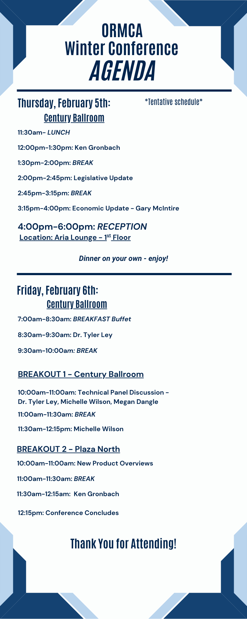 Join us on Thursday, Feb. 5, from 11:30 a.m. to 4:00 p.m. for speakers, exhibitors, lunch, and networking. Thursday night we will also have a reception from 4:00-6:00 p.m., followed by dinner on your own. Friday, Feb. 6, will begin with breakfast at 7:00 a.m., followed by speakers starting at 8:30 a.m. and concluding at 12:15 p.m.